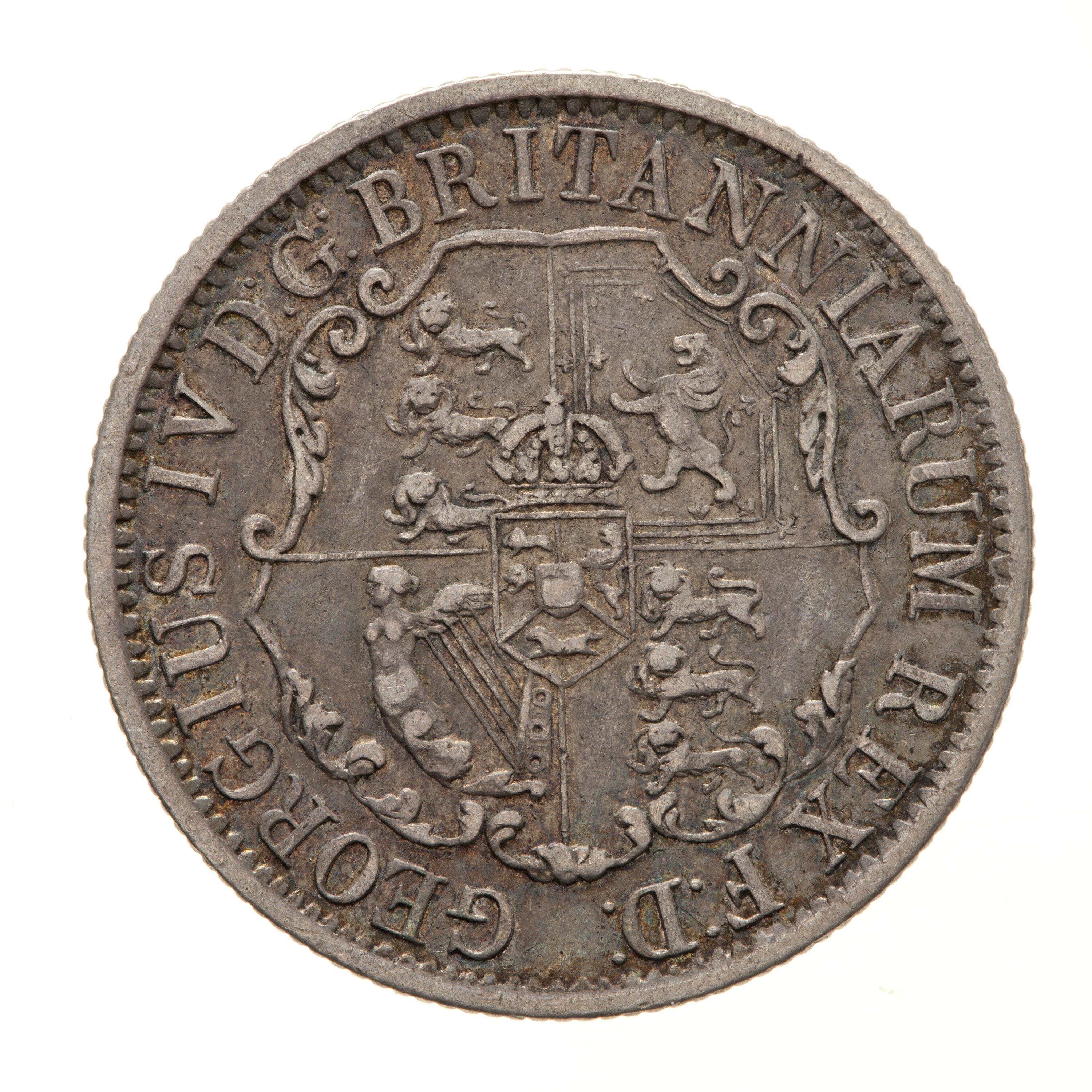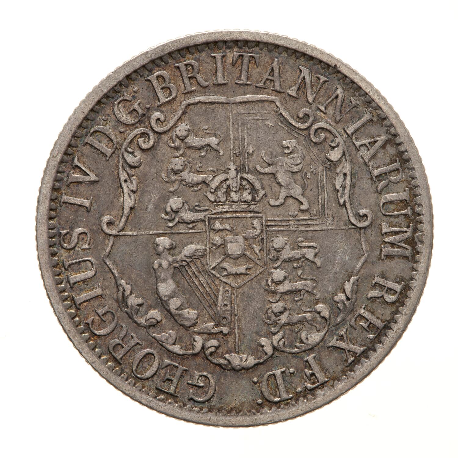 At centre, an ornate shield bearing the arms of King George IV; at centre, the crowned shield of Hanover containing the two lions passant guardant of Hannover, the lion rampant within a semy of hearts of Luneburg and the horse running to the left of Westphalia, quartered around, in I and IV, the three lions passant guardant of England, in II, the lion rampant within a tressure of Scotland, in III, the harp of Ireland; around, GEORGIUS IV D:G: BRITANNIARUM REX F:D: