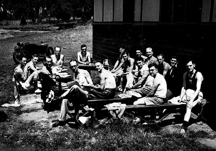 A group outside at a Young Mens Christian Association conference. There is a building on the right and a motorbike in the background. The men called themselves the 'Y's men' and the women the'Y's Menettes'.