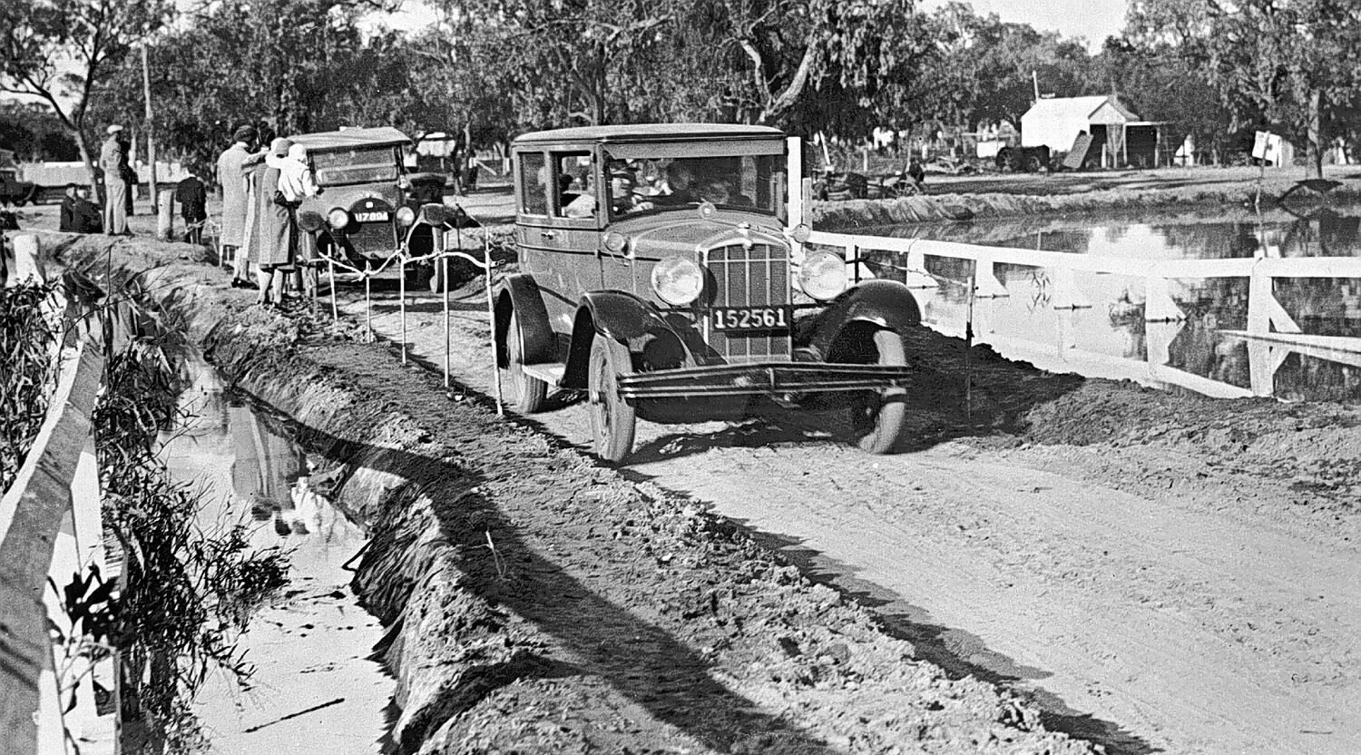 Cars on an embankment beside the flooded Darling River.