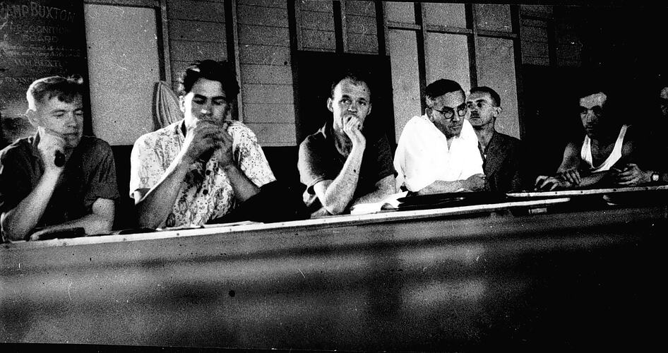 Six men seated at a table at a meeting of the Y 's Men at Camp Buxton.