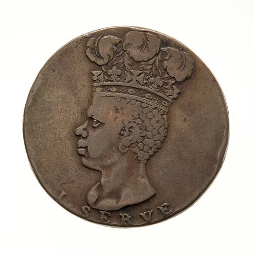 The head of a slave facing left, wearing a coronet and three feather plume; below, I SERVE; artist's initial, M, incuse on neck trucation.