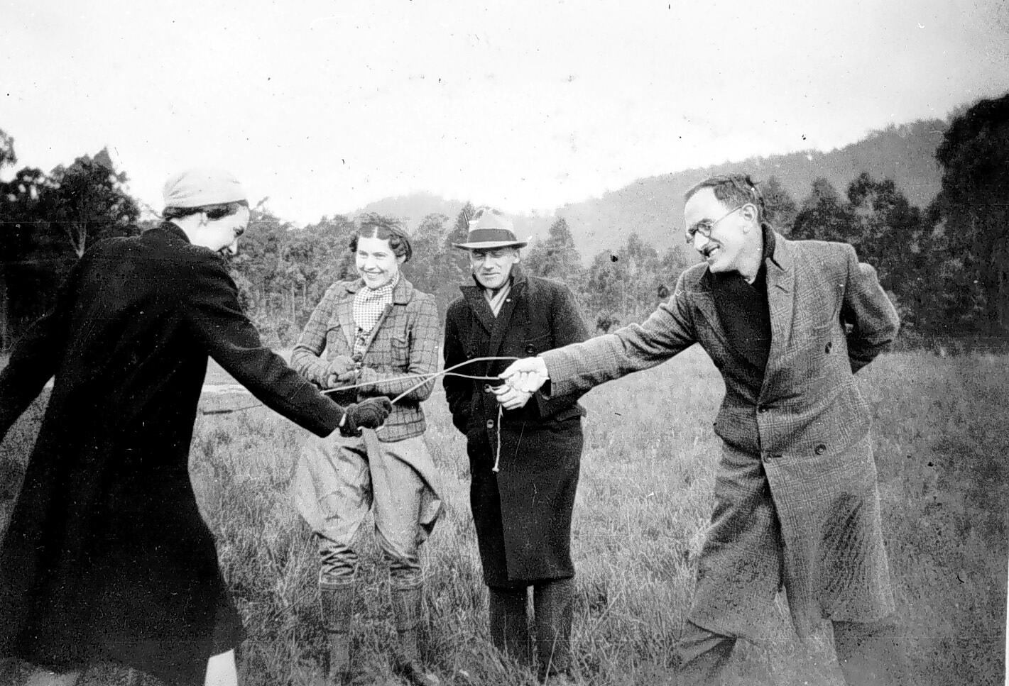 A man and woman having a mock duel with twigs while another couple watch.