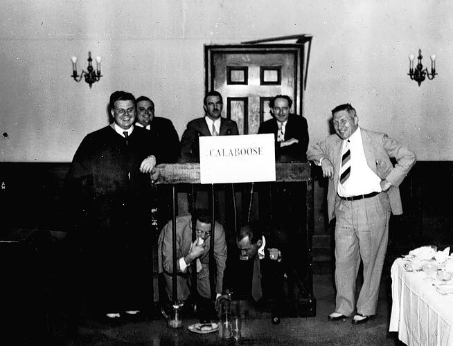 Two men in a cage structure. Five other men stand beside the cage laughing a sign above the cage reads 'Calaboose'. It was apparently part of a function by the Y's Men's club at Hunt-Patterson (?).