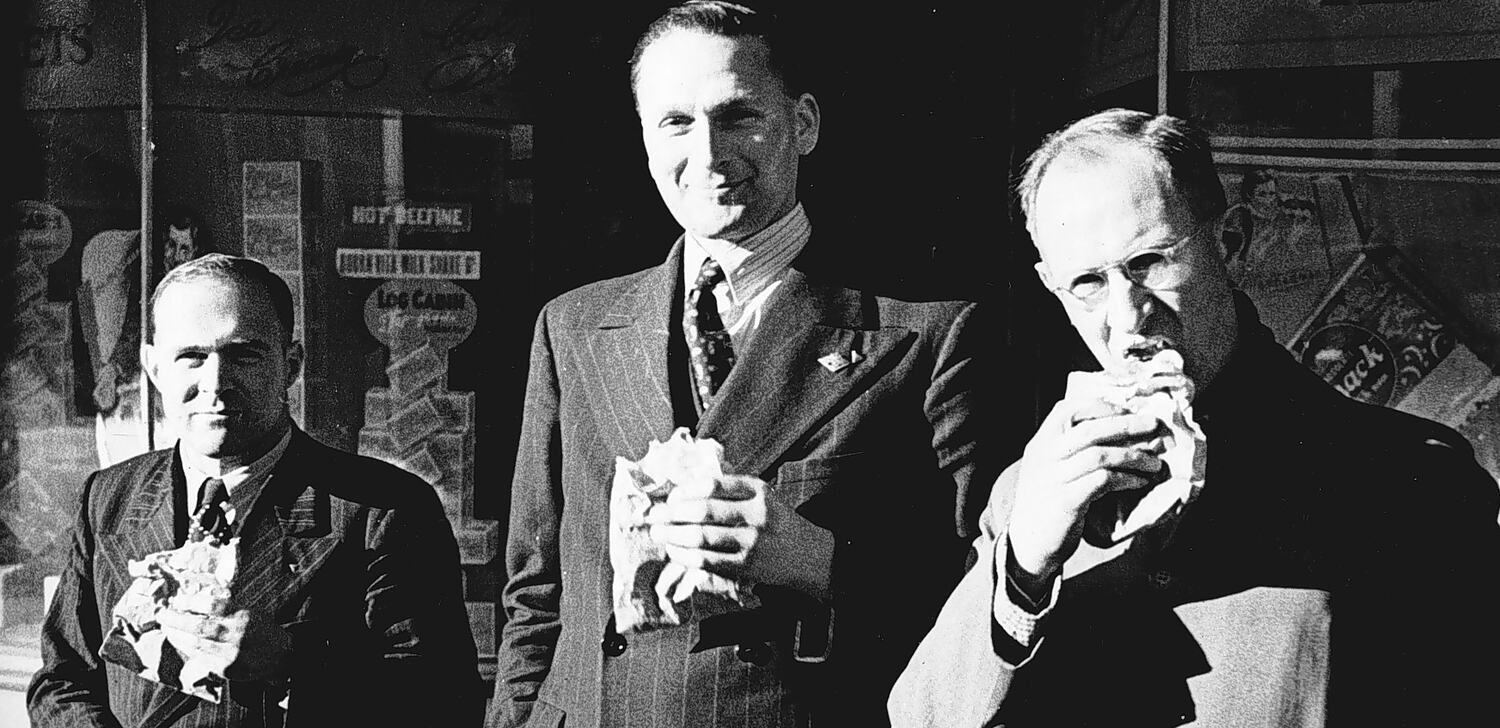 Three men eating meat pies from paper bags outside a shop. They are Col Willis, Ron Rogers and Cyril Henshaw. The two men on the left wear double-breasted pin striped suits with spotted ties and striped shirts. Both have a triangular pin on their left lapel and the man in the middle also has a diamond shaped pin. The man on the right has round spectacles and appears to be wearing a coat. Signs in the shop window behind them read "Ice Cream', 'Sweets', 'Hot Beefine' beef tea and 'Log Cabin' tobacco.