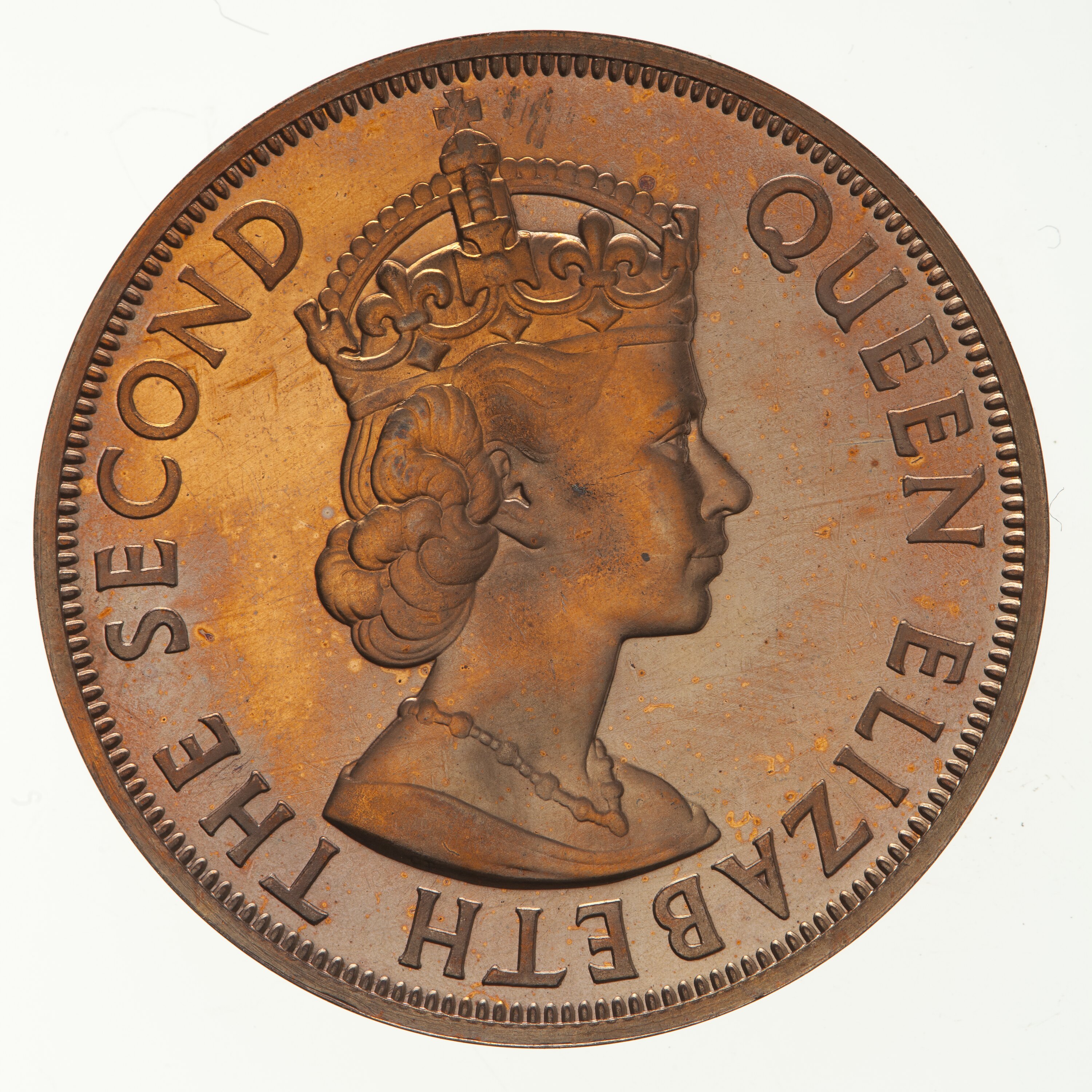 Crowned bust of the Queen facing right; around, QUEEN ELIZABETH THE SECOND; the artist's initials, CT, incuse on the bust truncation