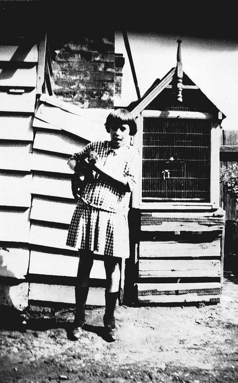 A young girl holding a puppy. She is standing beside a birdcage.