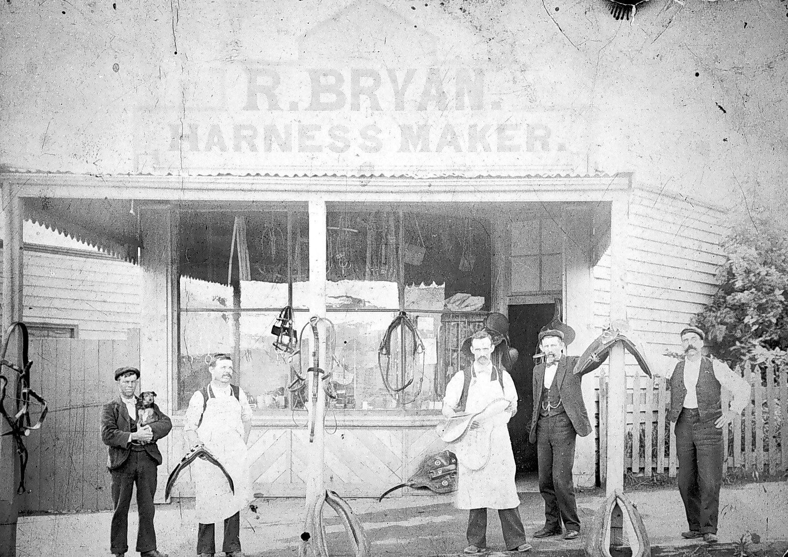 Staff in front of the shop of R. Bryan, Harness Maker. The four men are displaying saddles, a young boy is holding a dog.