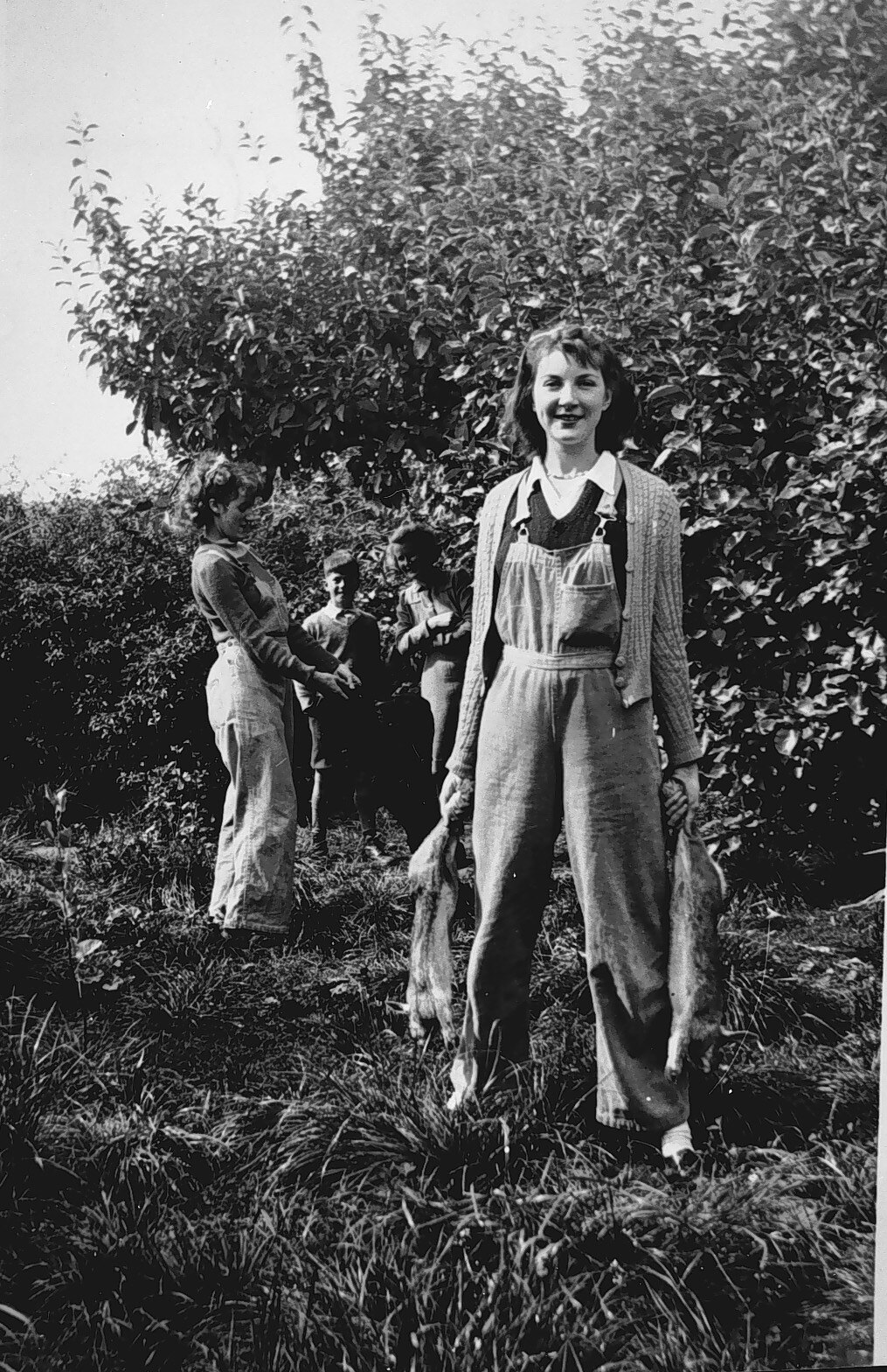 A girl holding two rabbits caught with the use of ferrets.