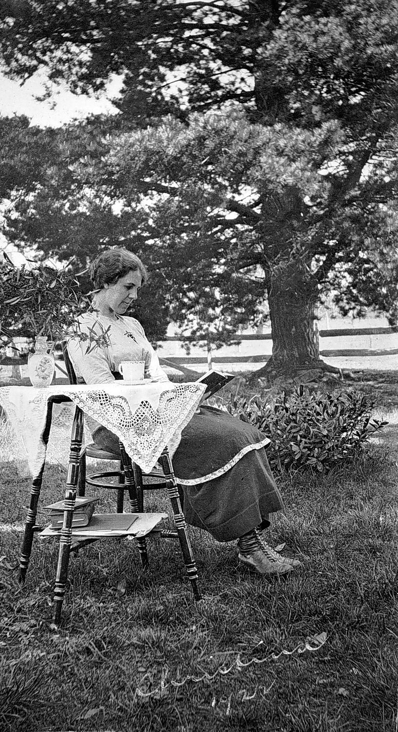 A woman reading in a garden. She is seated beside a table covered with a lace cloth and which carries a vase of flowers and a cup and saucer.