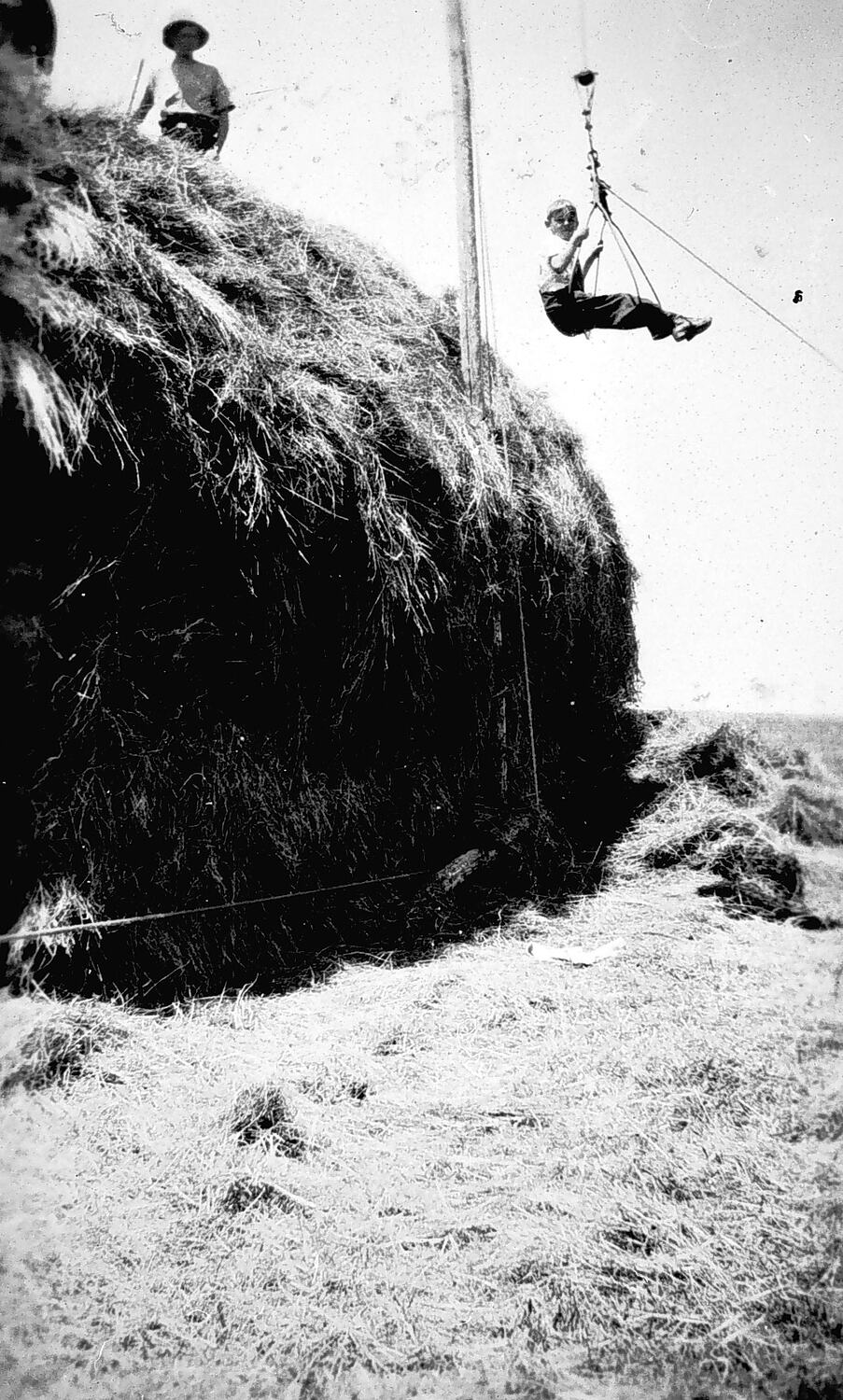 A boy is being raised by a winch to the top of a haystack.