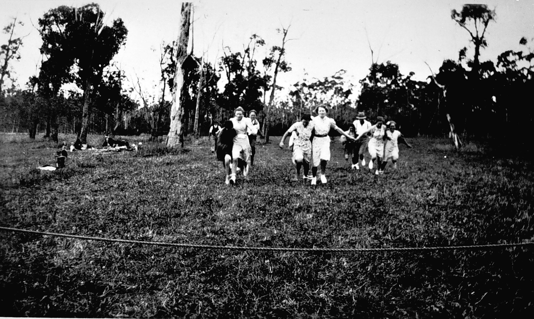 A group of women competing in a three-legged race at a picnic.