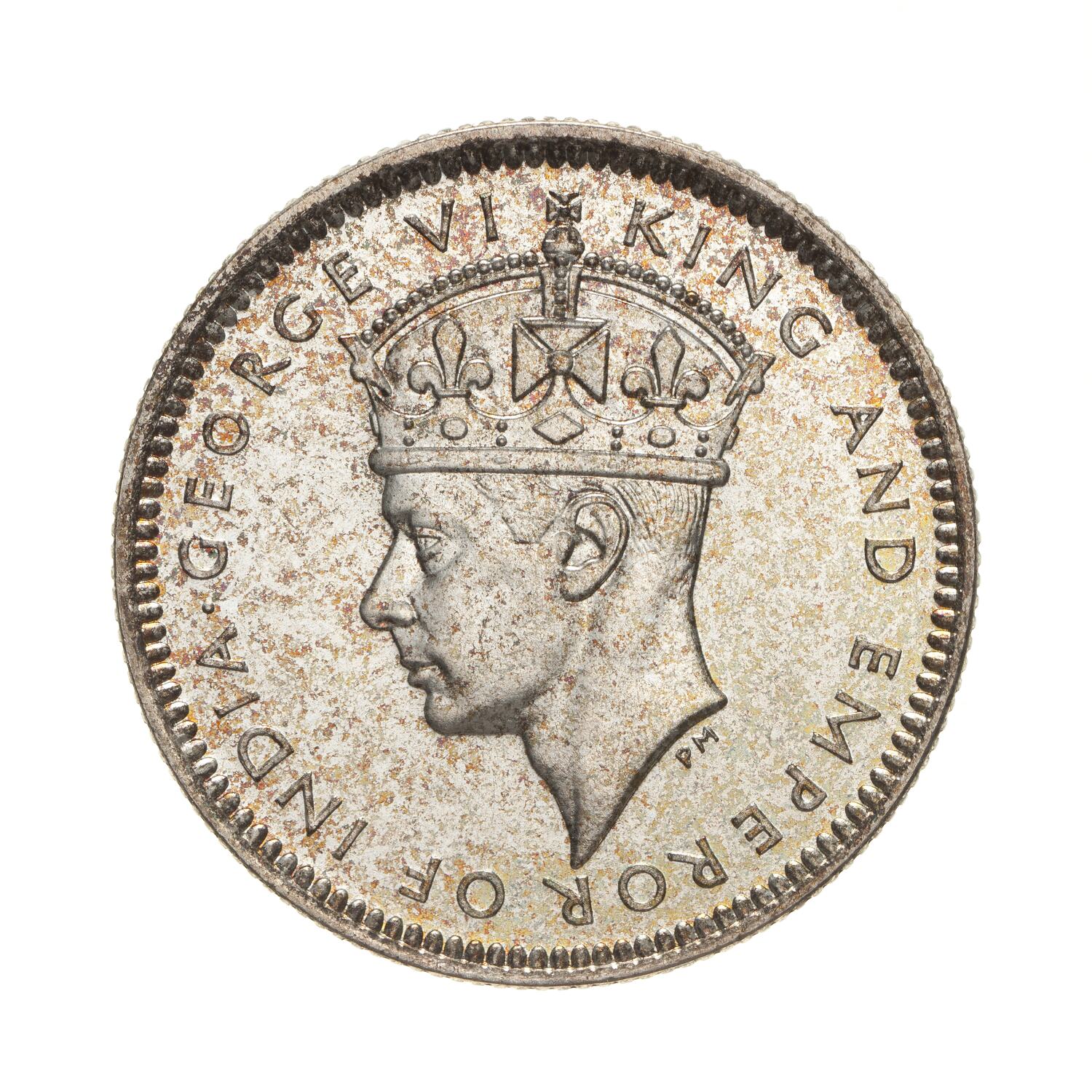 Crowned head of the King facing left; around, GEORGE VI KING AND EMPEROR OF INDIA; below the neck truncation in small letters the artist's initials, PM