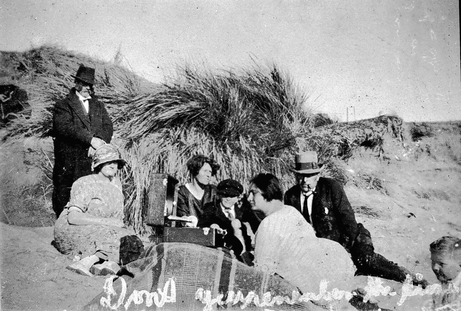 A group of men and women at a picnic in sand dunes. They have a portable gramophone.