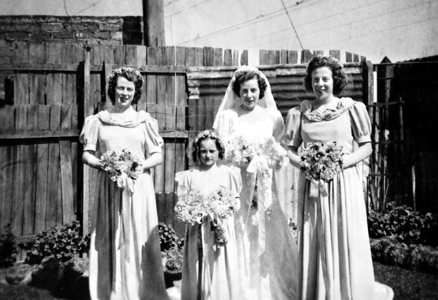 A bride with two bridesmaids and a flower girl. They are standing in a backyard.