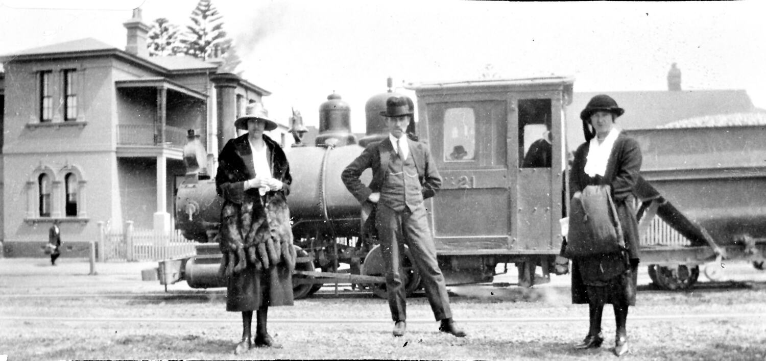A man and two women standing in front of locomotive 21. There is a two storied building on the left.