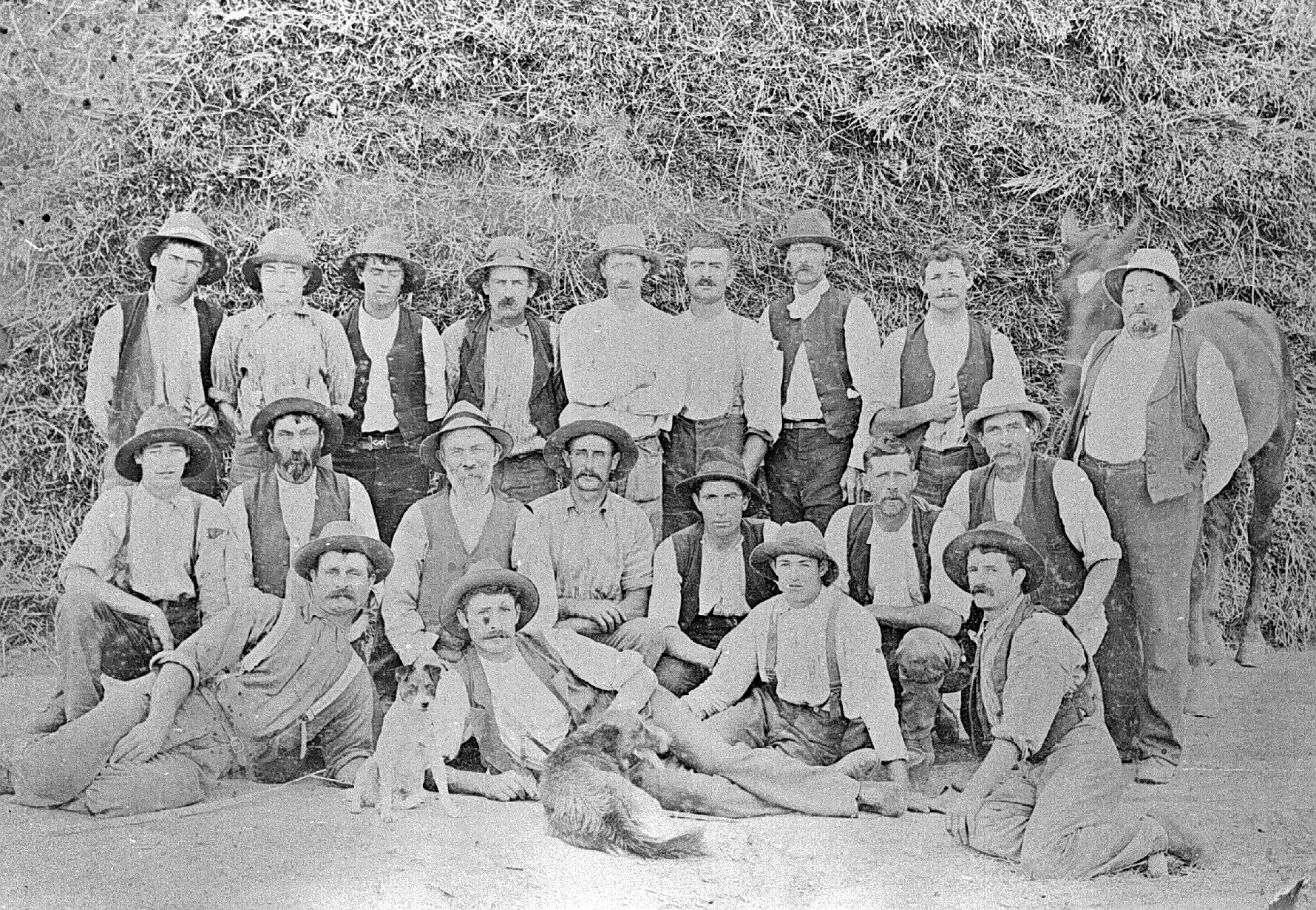 Members of the Cock family and farm hands in front of a haystack on 'Gladstone Park' station. The men are wearing hats with vests and suspenders. A horse is standing behind the men and two small dogs are sitting before them.