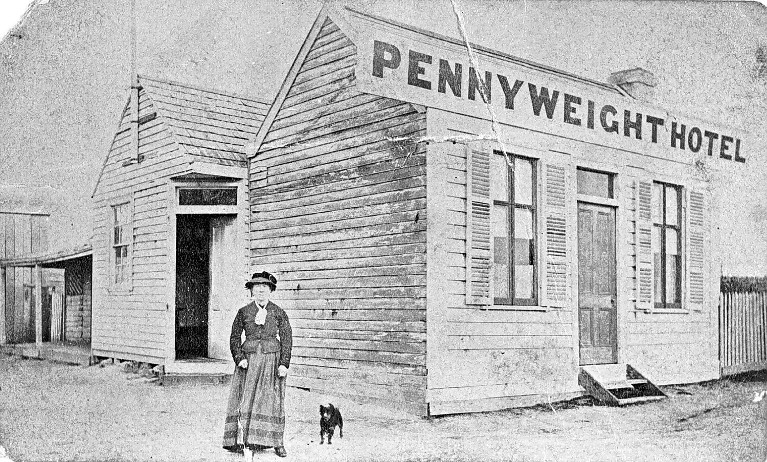 A woman and dog outside the Pennyweight Hotel. The woman is wearing a dress and jacket with a hat. There is a small staircase at the entrance to the hotel, located directly in front of the door. There are two large windows located on either side of the door, and the chimney is seen to the right. The hotel appears to be Victorian timber. There is another building behind the hotel, and the door is open.