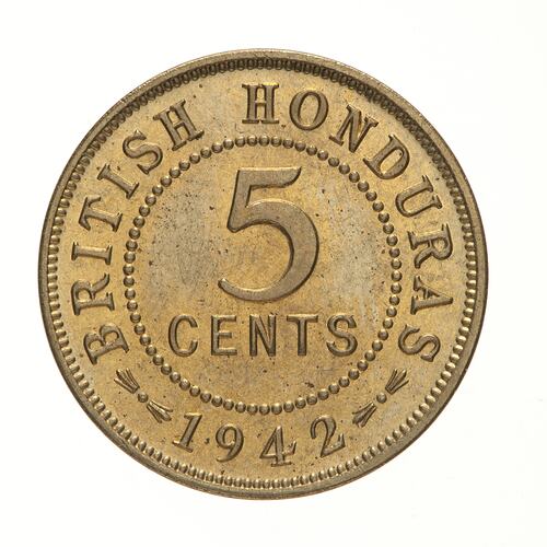 At centre in two lines within a circle of beads, 5 / CENTS; around, BRITISH HONDURAS 1949