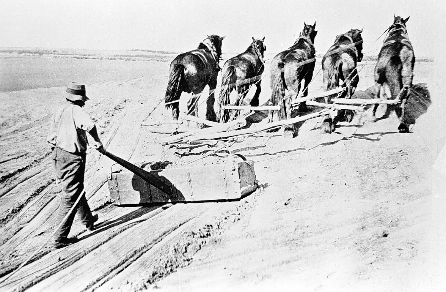 Jack McCrae using a two-metre buck-scraper on a deep cutting through a sand rise. The channel was to fall three inches in a mile.