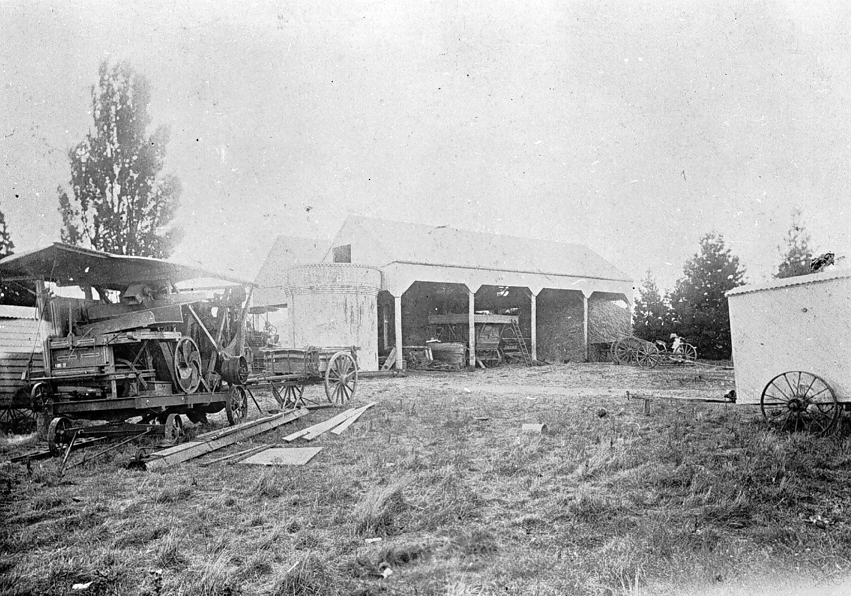 Hayshed and 17,000 gallon brick water tank constructed by William Ross. Chaffcutter in foreground and threshing machine in the shed. There is a water tank next to the shed, and a small haystack inside. There is a carriage to the front right of the image, and a small cart in front of the haystack. There are planks of wood next to the chaffcutter, and there are several trees surrounding the area.