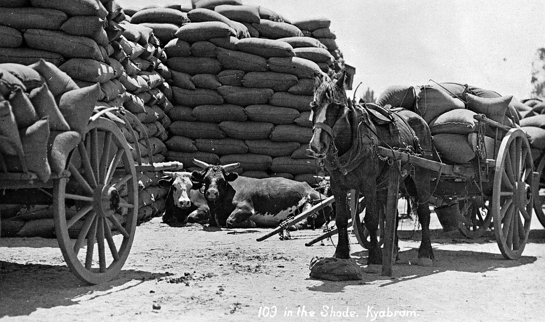 Wagon loads of grain waiting to be unloaded. There is a horse and cart on the right and two bullocks resting in the middle of the photograph.