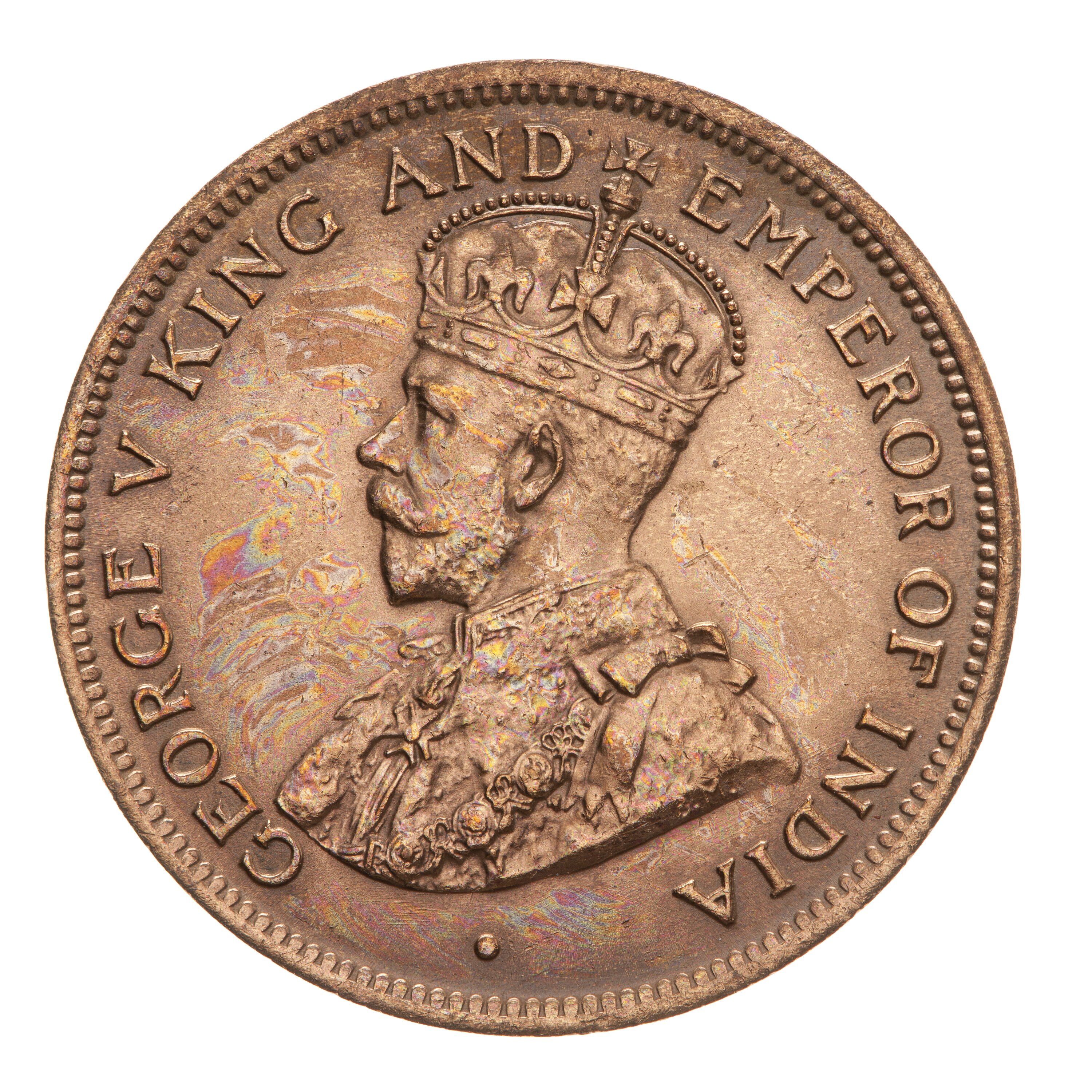Crowned and robed bust of the King facing left; around, GEORGE V KING AND EMPEROR OF INDIA; on bust truncation in small letters the artists initials, BM