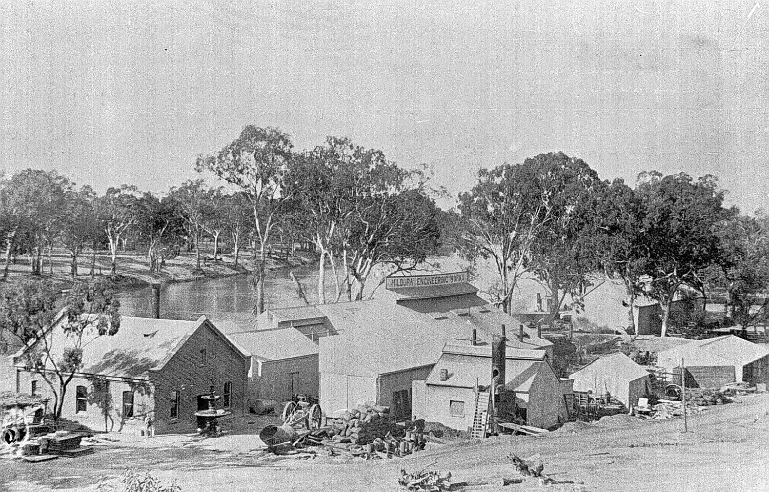 The buildings of the Mildura Engineering Works on the bank of the Murray River.