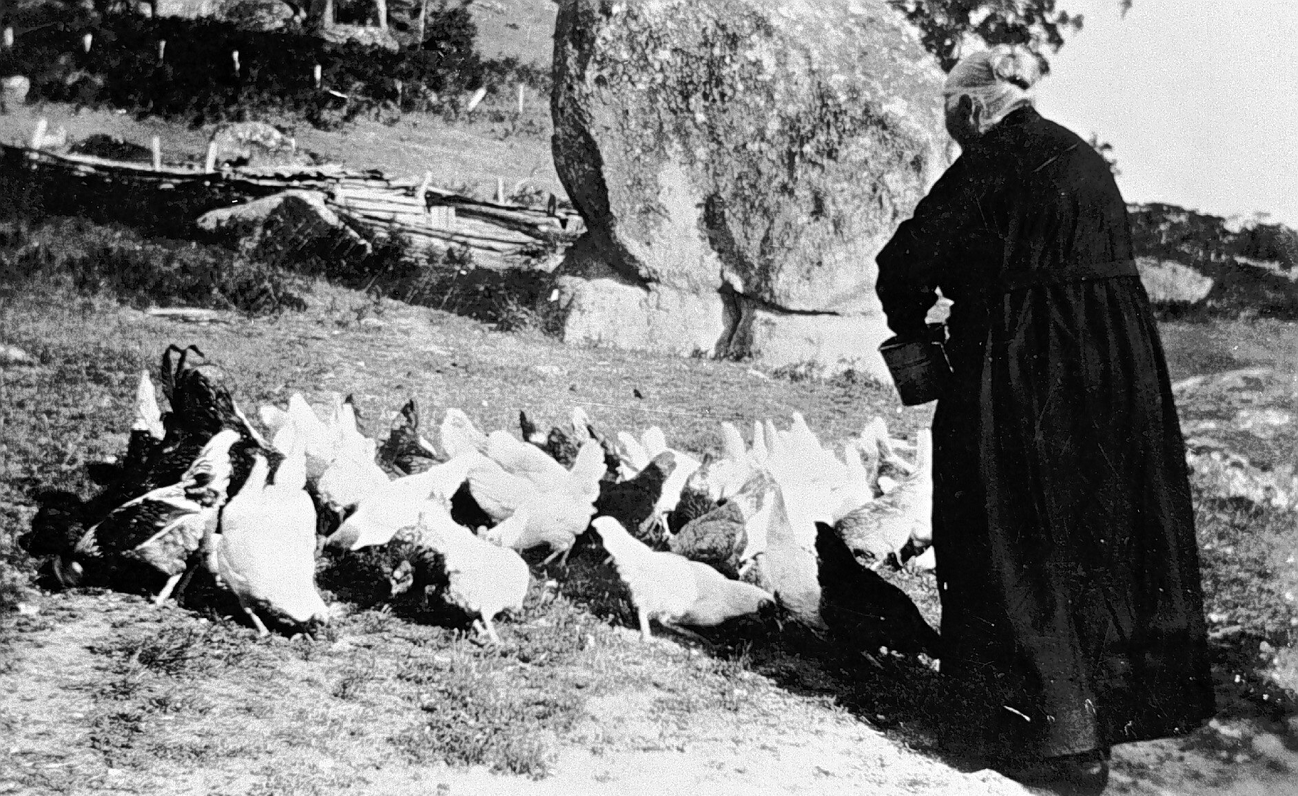 An elderly woman feeding poultry. There are pig sties behind the rock.