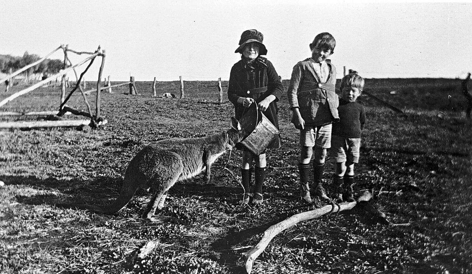 Three children feeding their pet kangaroo.