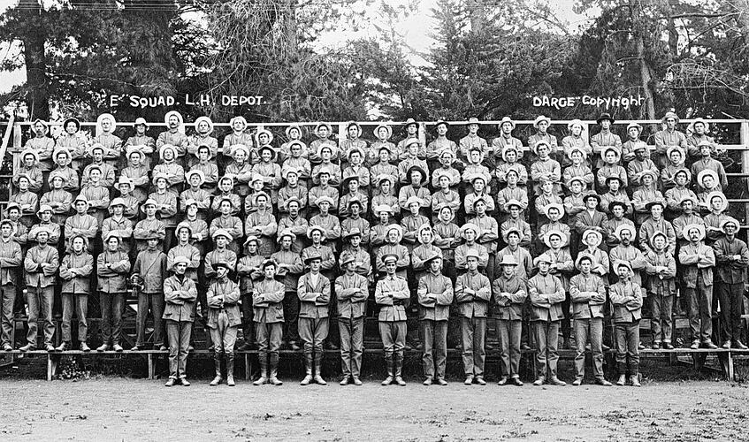 Group portrait of E Squad, 13th Light Horse Regiment. The photograph was taken around 1915 in Broadmeadows.