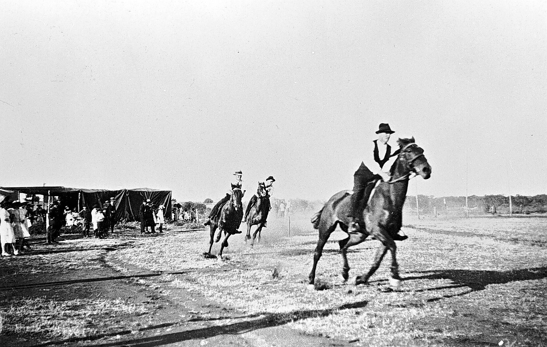 The trotting race at the Nandaly sports. In the background are the football goalposts, the boundary furrow, the temporary crowd shelter and well-dressed spectators.