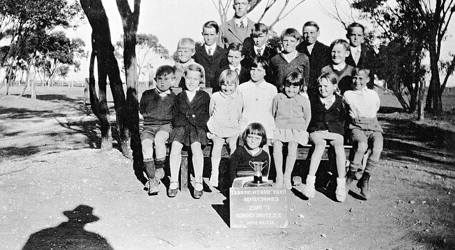 Teacher and pupils of Beulah School. There is a silver cup on a box in the front with a board bearing an inscription which cannot be read. (Ammended) Written Backward: 'BABY"SOUTH STREET/COMPETITION/1" PRIZE/S.S.STONE CHURCH/ACTION SONG'