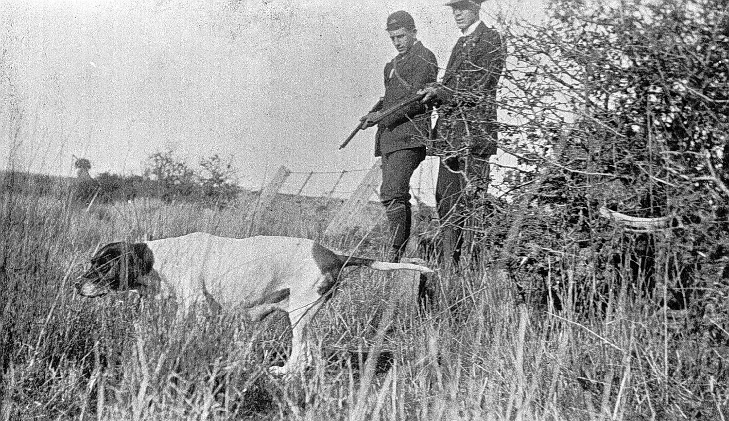 Two men and a pointer dog hunting for quail.