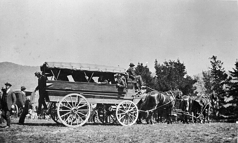 People dismounting from a horse-drawn vehicle after travelling by train to ovens vale to attend a clearing sale at 'Happy Valley' homestead.
