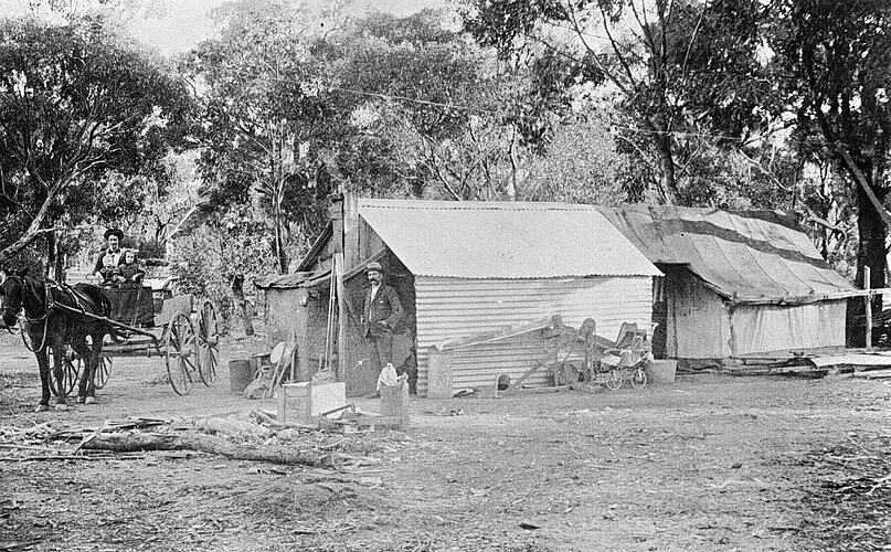 Bush settler 's temporary home. There is a woman and child in an open four wheeled farm trap with horse on the left The building is partly constructed from corrugated iron with a tent in the rear.