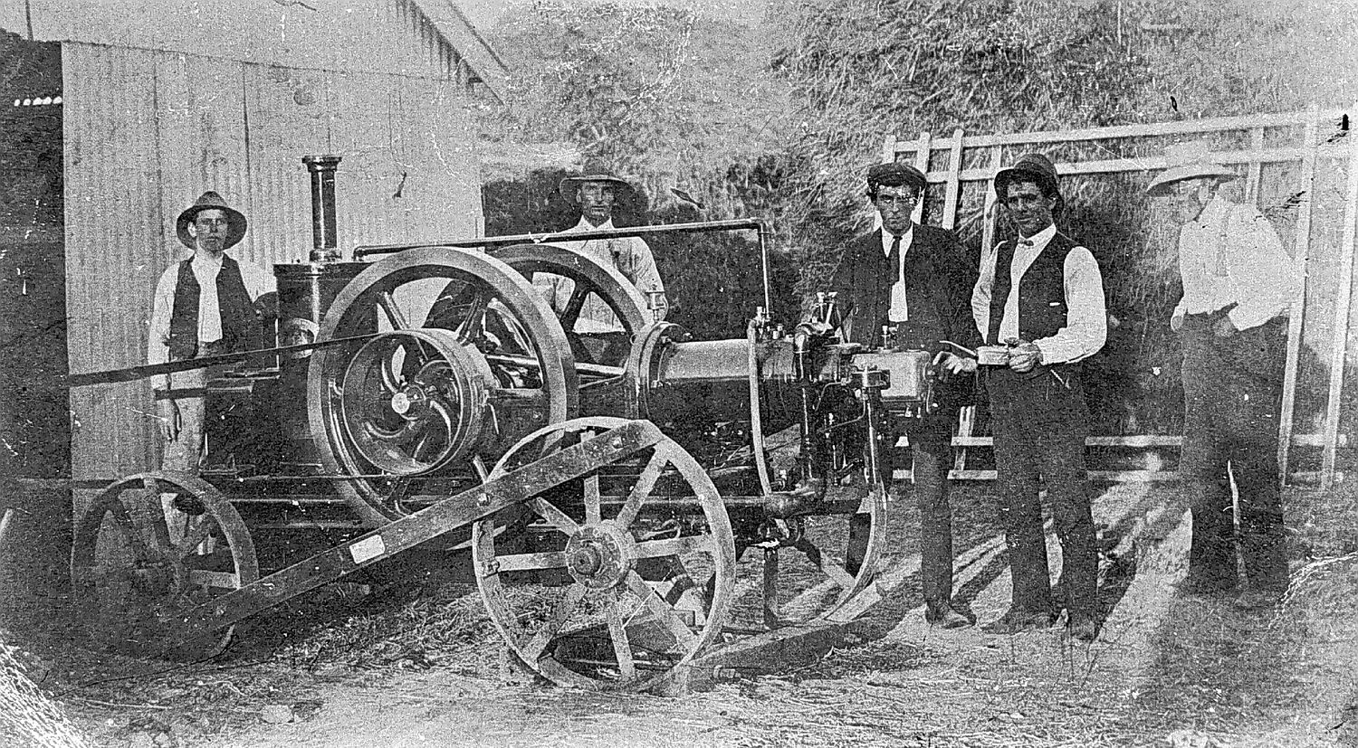 Five men with an 8 hp 'Ronaldson-Tippett' portable farm engine, probably driving a chaff cutter.