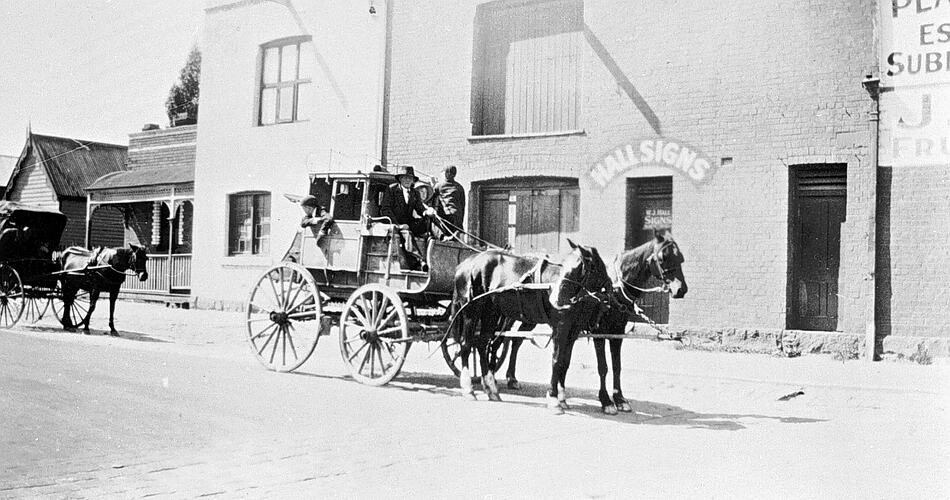 A stage coach and horses in Lowe Street, Ballarat. 'Hall Signs' in the back- ground.