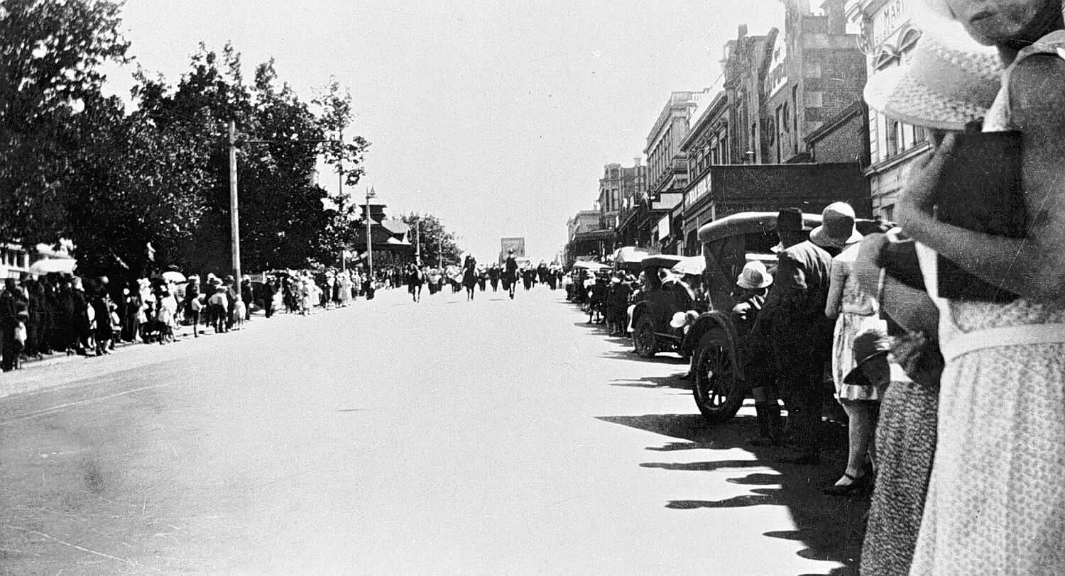 Negative of a crowd watching a band approaching during a Labour Day procession in Ballarat in 1925.