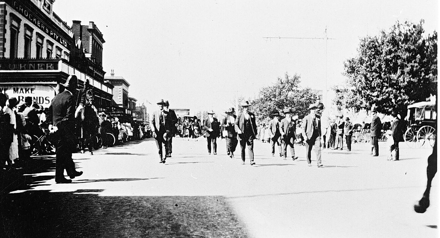 Black and white negative of men marching during the Labour Day procession in Ballarat in 1925.