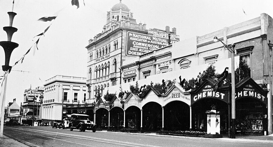 Shops decorated for the Ballarat centenary celebrations.