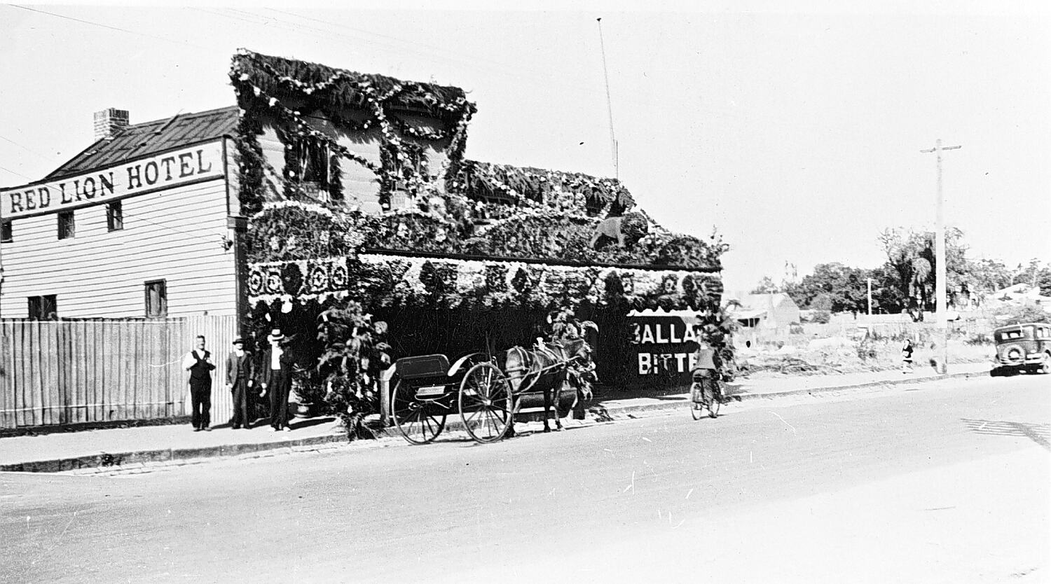 The Red Lion Hotel decorated for the Ballarat centenary celebrations. A horse and gig is parked in front.