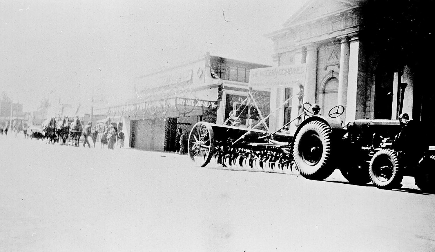 A tractor and cultivator in the street outside the Masonic Temple. Bryant and Gourlay, Fruit Merchants, in the background.