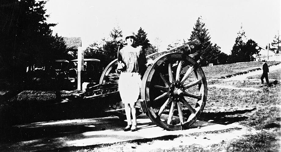 A woman posed in front of a field gun at the Eureka Stockade site.
