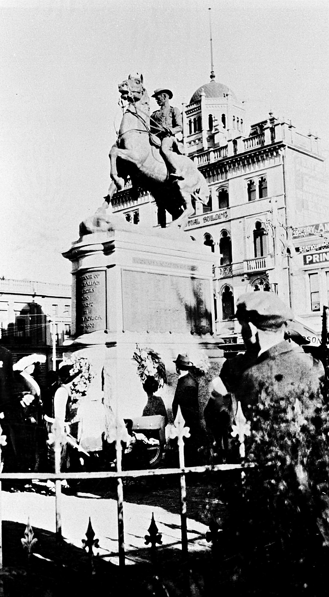A group of people beneath the Boer War memorial in Sturt Street, Ballarat, Victoria. This memorial statute was the work of sculptor James White and was dedicated in 1906. In the background is the National Mutual Insurance Building.