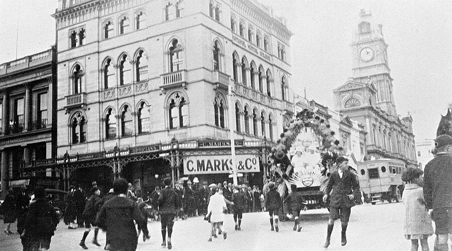 A group of children running behind a decorated vehicle. Building belonging to C. Marks & Company Jewellers is in the background.