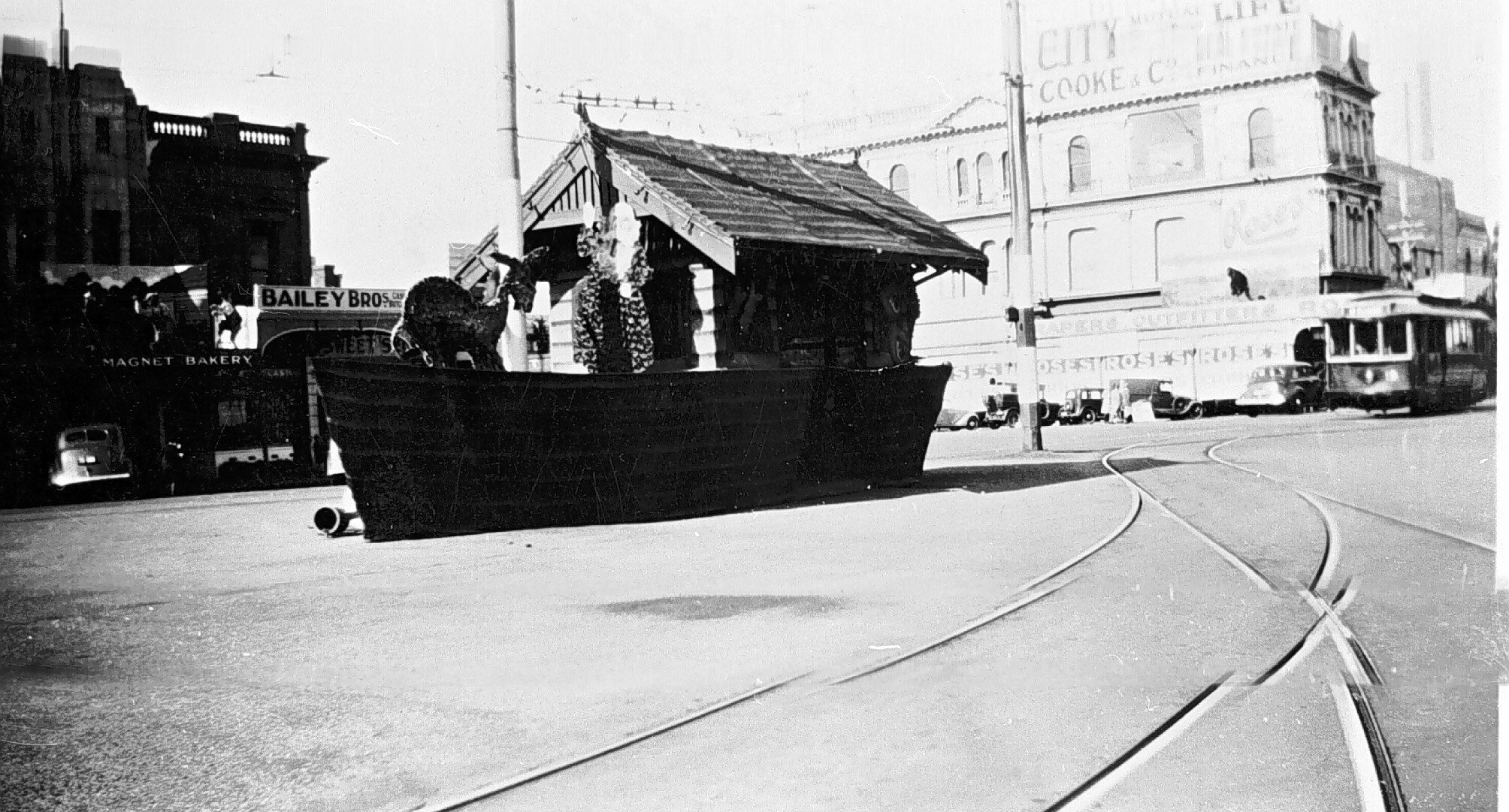 A tram shelter decorated for the Ballarat centenary celebrations. It has, apparently, been decorated to look like a boat. Bailey Brothers, Butcher, in the background.