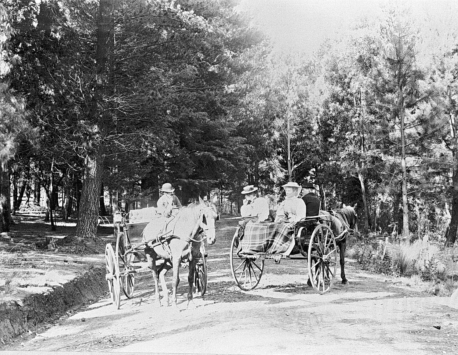Women in two horse-drawn vehicles talking at the Water Reserves, Ballarat. The women in the vehicle on the right are seated facing backwards.