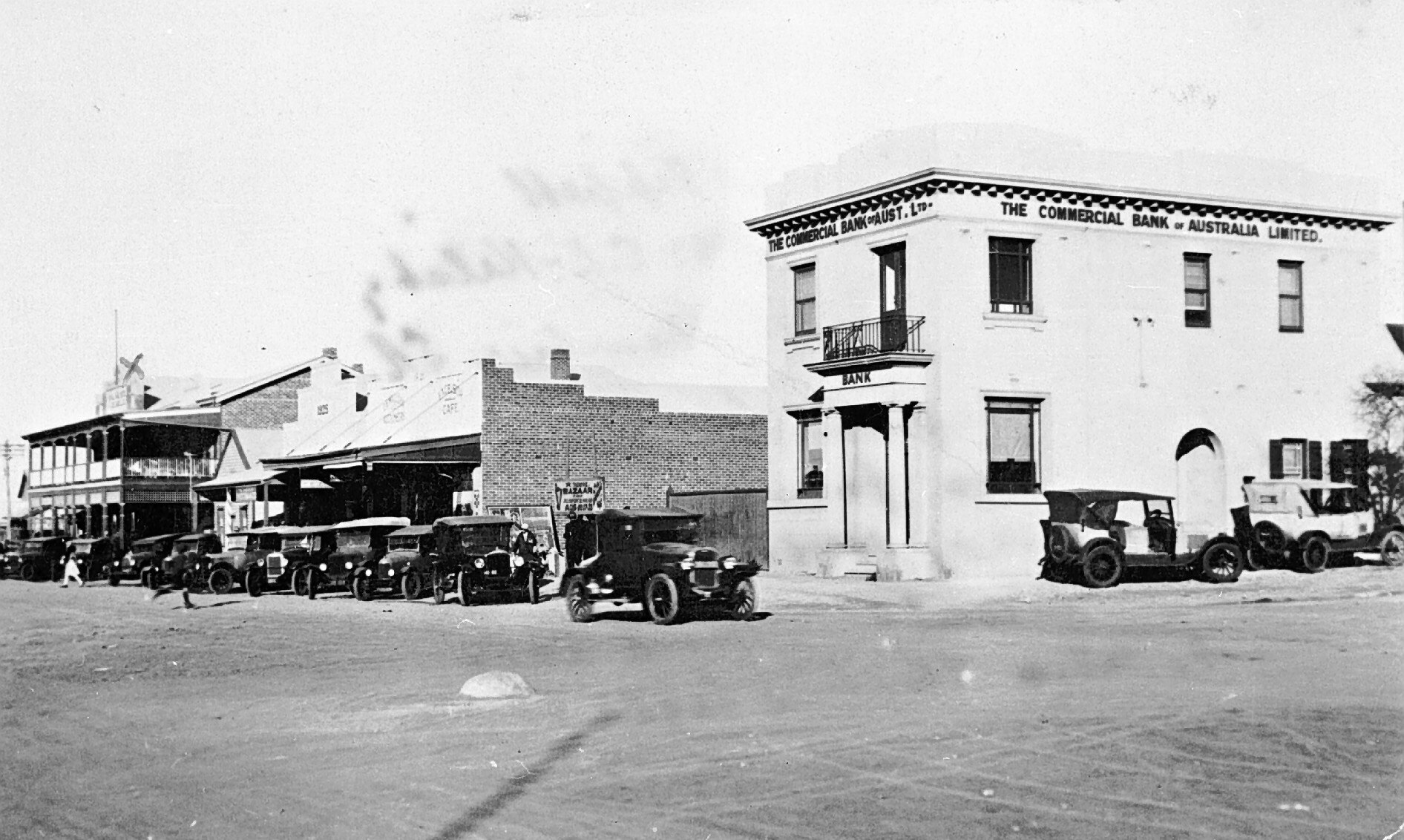 A street in Lake Cargellicoe with the Commercial Bank of Australia on the right and the Royal Hotel in the background. There are a number of cars parked in the street.