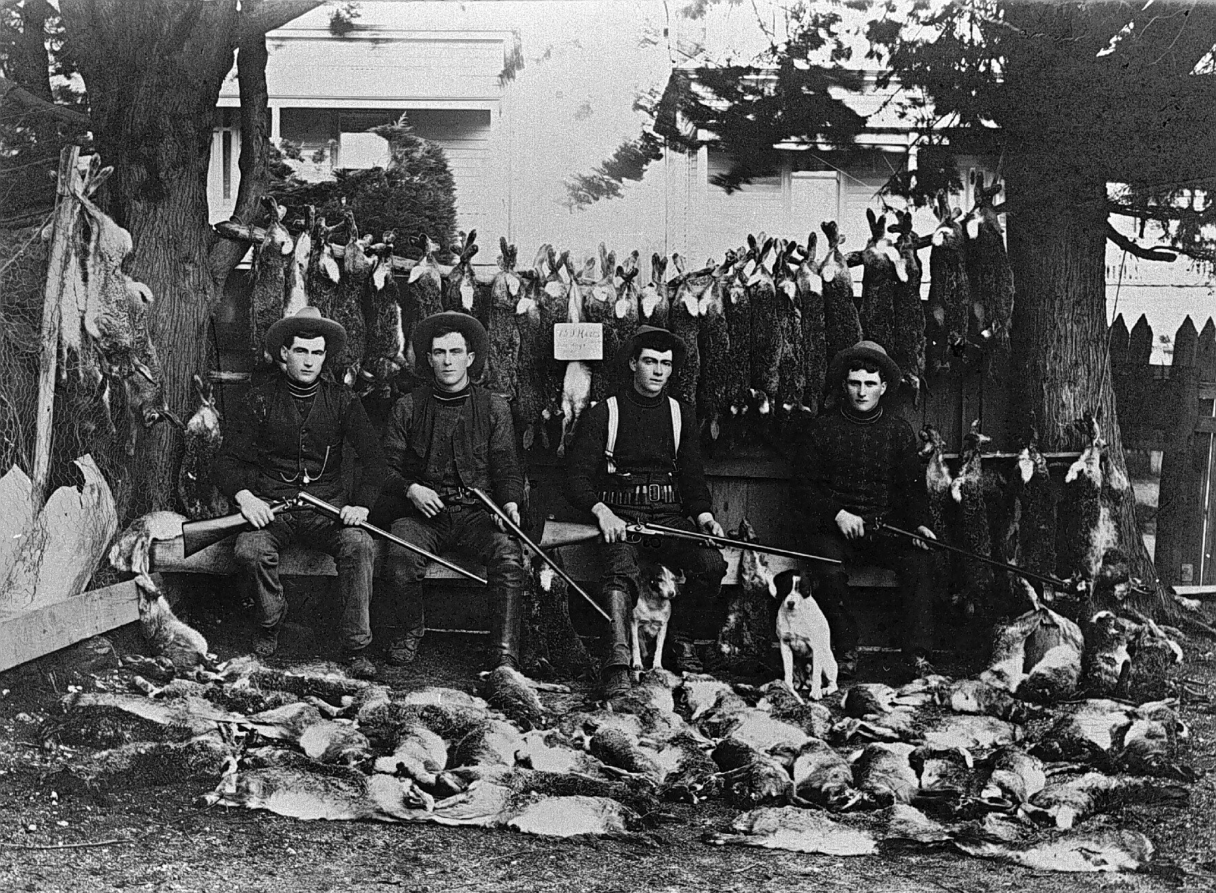 Five men and their dogs with their catch. A notice reads '159 hares in a day'.