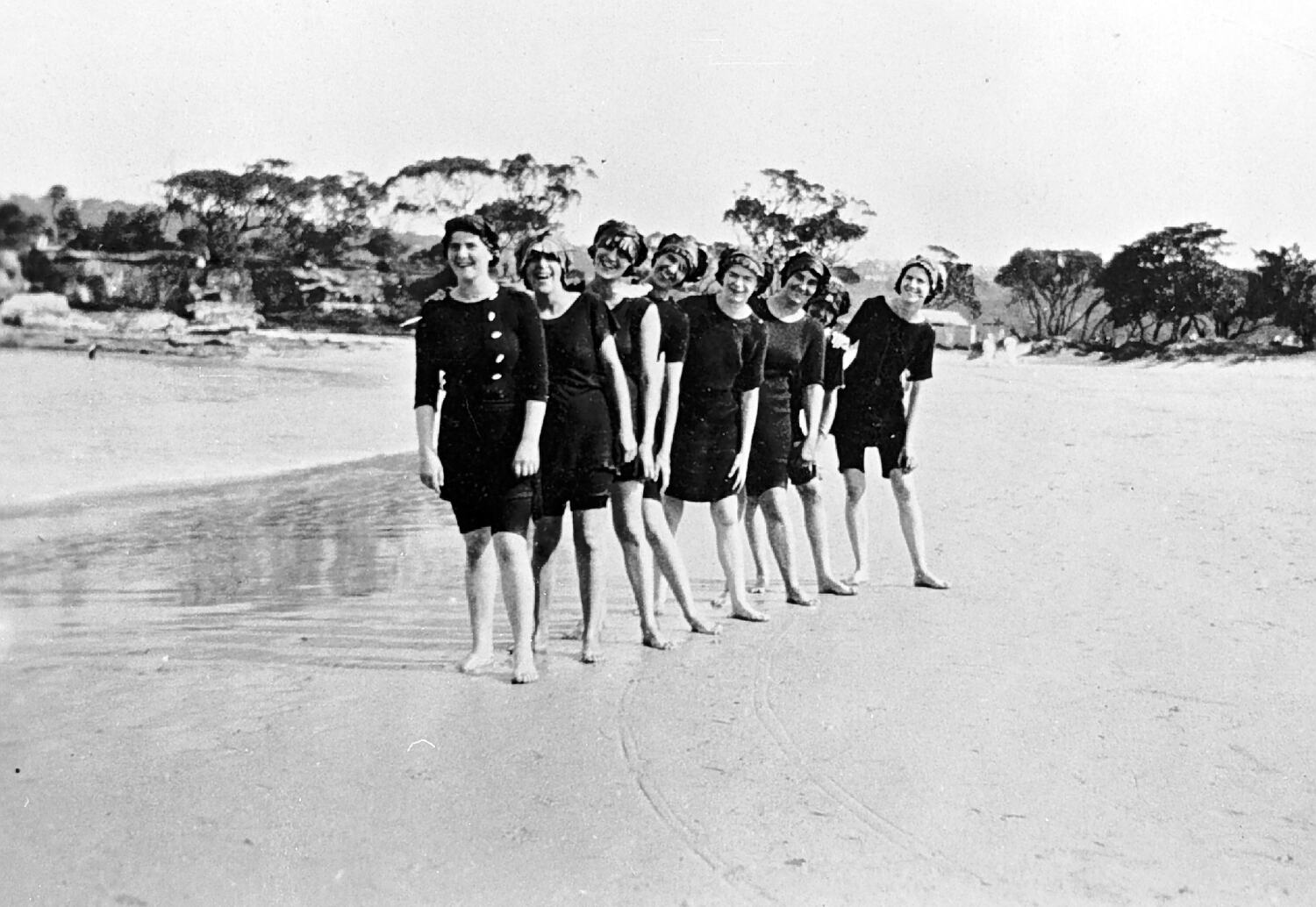 Seven women in bathing costumes posing on the beach.